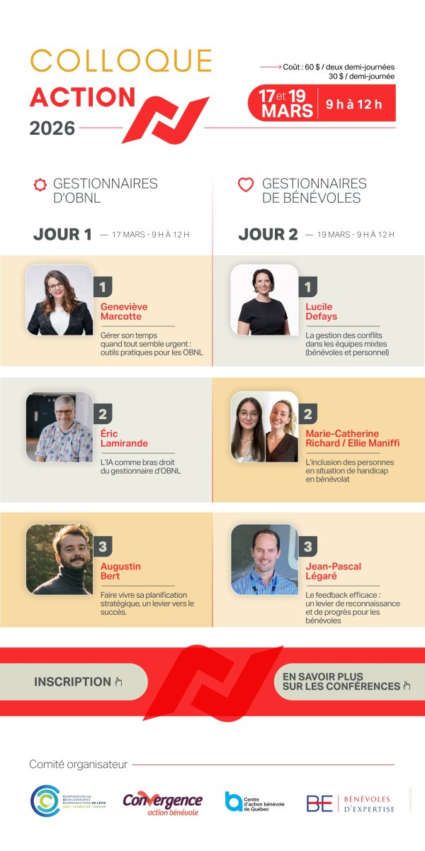 Les 17 et 19 mars se déroulera le Colloque-Action édition 2026! Deux avant-midis dédiés aux gestionnaires d'OBNL et aux gestionnaires de bénévoles. Axées sur le concret, ces avant-midis uniques visent à vous outiller concernant divers thèmes et sujets de votre quotidien. Au fil de chaque jour du colloque, trois conférences-éclairs de trente minutes se succèderont, chacune étant suivie d’une période de discussion de quinze minutes.